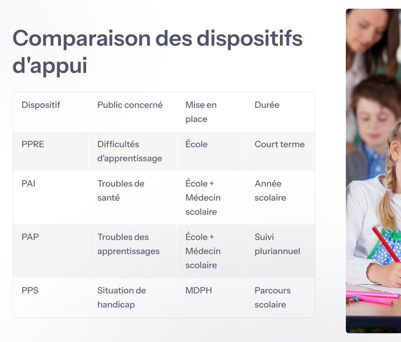 Selon les besoins spécifiques de chaque élève, divers dispositifs sont mis en place pour garantir l'accessibilité aux apprentissages. Ces mesures personnalisées permettent d'assurer la réussite de chaque élève en fonction de son profil.